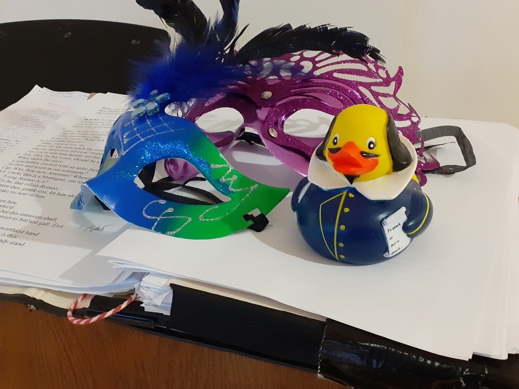 2020 started with lots of colour! In October we announced that we’d channel the two “households both alike in dignity” into two teams: Team Red and Team Blue. And so it has begun: Team Red, the House of Montague; Team Blue, the House of Capulet; and those not clearly aligned with one of the house, constitute Team Black. As we decided to set the play’s background into modern times, we were looking for these three colours that could be visibly worn by all actors. Last week our costumes team handed out some essential items for all actors — highlighting the colour theme of and, of course, adding some bling! So here is the cast, donning their red, blue and black bandanas.